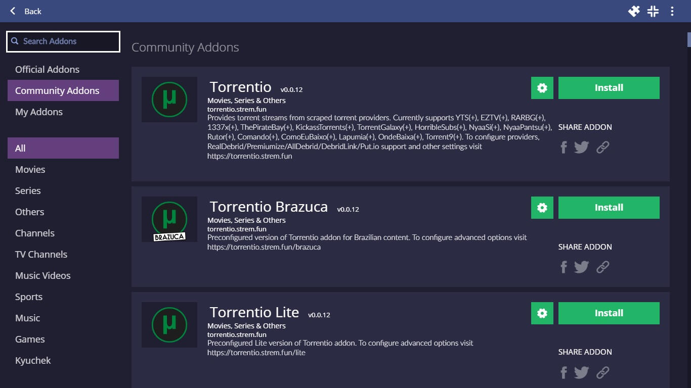 Odată ce deschideți aplicația, veți găsi ecranul principal, unde veți vedea serialele și filmele populare. Pentru a accesa Torrente, va trebui să selectați pictograma puzzle, care vă duce la lista de suplimente disponibile de instalat. Există multe servere care funcționează bine, dar cele pe care le recomandăm să le instalăm sunt The Pirate Bay+ și Torrentio, care reunesc mai multe site-uri torrent într-un singur plugin. Acestea duă sunt cele mai bune complemente și aproape întotdeauna au cea mai bună calitate.Pentru a instala suplimentele trebuie sa deschideți pagina aceasta in dispozitivul unde instalați stremio sau copiați linkul și îl atașați in pagina de căutare a aplicației stremio.